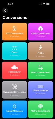 • BTU, Cubic, Flows, Ft-Lbs, Horsepower, HVAC, Hydraulic, Linear, Liquid, Metric (460 conversions), Power, Pressures, Square Measures, Watts, and Weights